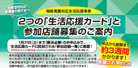 物価高騰対応生活応援事業として、食料品価格等の物価高騰の影響を受けている生活者の支援を目的に、西東京市より市内で利用できる生活応援カードを配布し、生活者の負担軽減や、市内の消費を喚起し、市内経済の循環及び活性化を図ることになりました。